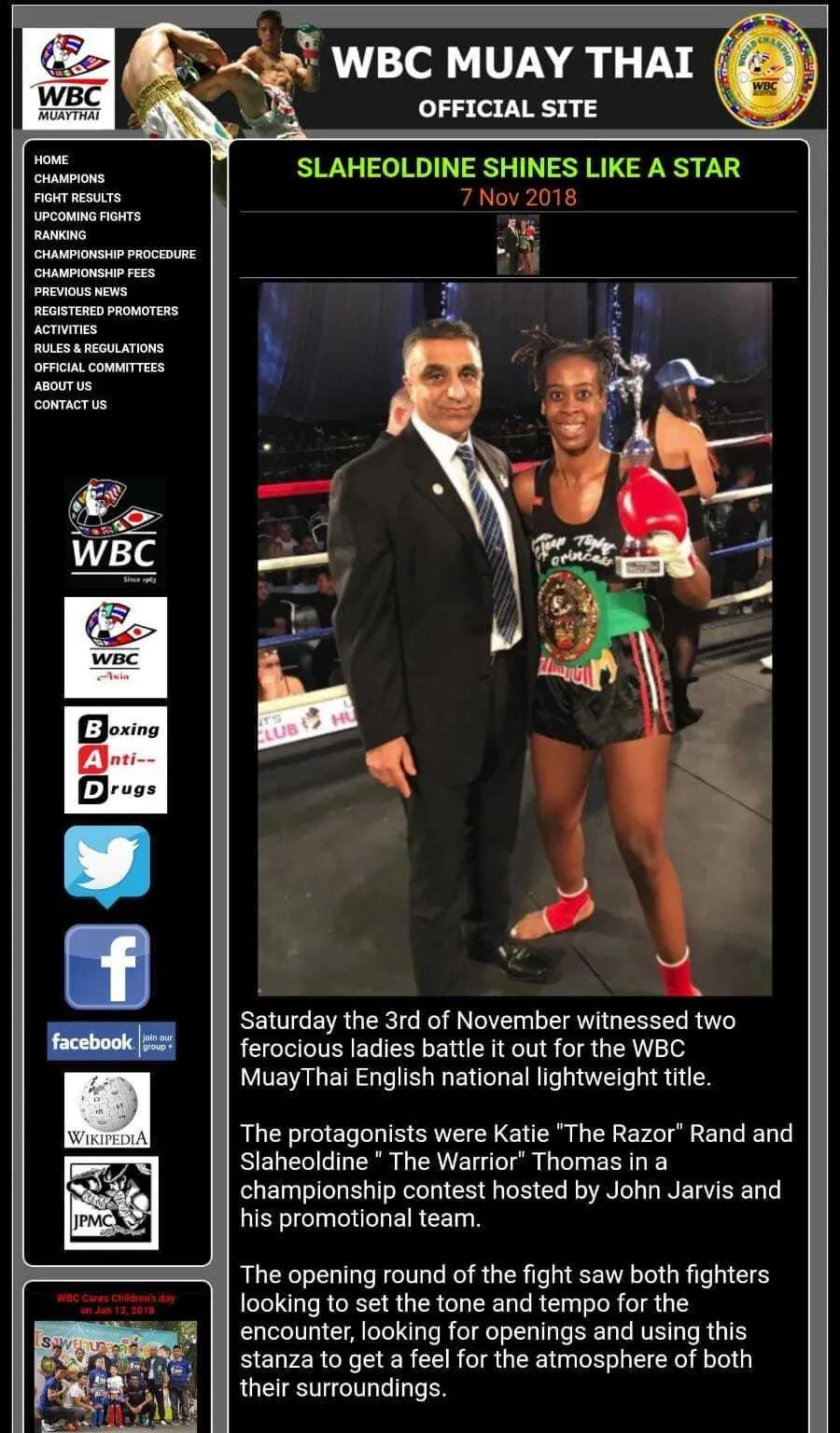 WBC Muay Thai Lightweight Champion of England. A UK Female A class (full Thai rules) Muay Thai Fighter with over 17 years Muay Thai experience, over 10 years fighting experience and over 9 years Muay Thai coaching experience. Slaheoldine has coached students from ages 3 to 50+, from juniors, amateurs to professional fighters. She has taken fighters from novice level to fighting their very first Interclub and amateur fights on big stages around the UK such as Scala nightclub in London and Bedford Corn exchange, In her own fight experience, Slaheoldine has had 14 fights, with 2 of her many wins by TKO both in round 3 out of 5 rounds; one by body kick to the sternum and the other by spinning back elbow. Not only has Slaheoldine fought all across the UK in some of the biggest venues such as The O2 in London, Effingham Park Hotel in Copthorne (where she was crowned WBC Muay Thai Champion winning by spinning back elbow in round 3) and her last fight at Pryzm Nightclub in Birmingham where her fight was the main event headlining fight, which is rare for women's fights on a predominantly male fight card, Slaheoldine has also dominated the Muay Thai scene in Thailand, the home and birthplace of Muay Thai. Slaheoldine is currently 3-0 undefeated in Thailand having fought and won in Phattalung, Patong Boxing Stadium in Phuket (where she scored her 1st TKO by body kick in round 3) and more recently in Chiang Mai Boxing Stadium. Slaheoldine has more recently been offered a world title fight on one of the biggest international Muay Thai fight promotions based in the USA against a very experienced fighter who beat Chris Cyborg in a Muay Thai fight. Outside of Muay Thai, Slaheoldine's talents have grabbed the attention of MMA fighters and she has been approached by a world renowned and very well respected professional UFC MMA fighter to train under him in Florida to fight on some of the biggest mixed martial arts promotions in the world such as Bellator and the UFC. Her decision on both of these opportunities still remain in the balance...Slaheoldine is also a keen advocate for women and equality in Muay Thai & martial arts including relative or equal treatment, pay and opportunities. She looks to help people build their confidence through the art of Muay Thai as from her own experience of being bullied at school and isolated, Muay Thai is what helped her with building her own confidence and attributes the sport to her becoming the woman she is today